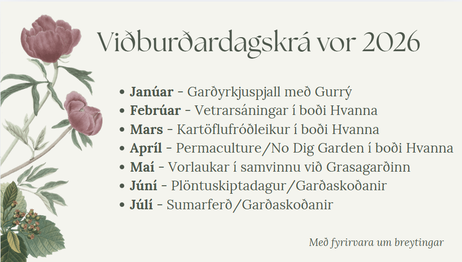Matjurtaklúbbur GÍ, Hvannir, stendur fyrir fræðsluviðburði:Hvað er og hvernig stöndum við að vetrarsáningu matjurta?Fimmtudaginn 12. febrúar kl. 19:30 í sal Garðyrkjufélagsins Síðumúla 1 (gengið inn frá Ármúla).Fyrir þá sem misstu af þessum skemmtilega viðburði í fyrra eða þá sem prufuðu og eru með spurningar eða reynslusögur. Fanney Margrét Jósepsdóttir, formaður Garðyrkjufélags Suðurnesja sýnir hvernig best […] [...]