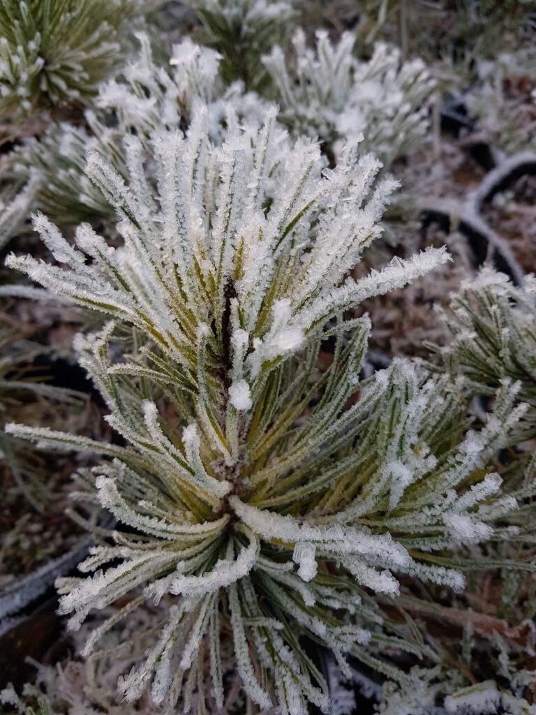 Yngri trjáplöntur í uppeldi kallast á við þær eldri í frostinu.