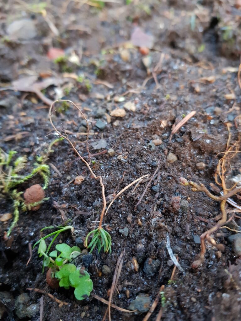 Litlar sjálfsáðar plöntur í blómabeði í Kópavogi lentu í frostlyftingu og liggja því rótarberar á frosnu yfirborðinu. Hið unga greni með sína löngu rót hefur meira að segja ýst nánast algjörlega upp úr moldinni.