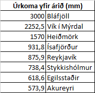 Hér sjáum við tölur yfir ársúrkomu á nokkrum stöðum, skv Veðurstofu Íslands. Fyrst 30 ára meðaltal (1971-2000, nema Bláfjöll og Heiðmörk) og svo tölur fyrir árið 2020. Við sjáum að miklu getur munað hvar maður er á landinu, en jafnvel er stutt á milli mjög breytilegra staða. Eins sjáum við að árið 2020 var Akureyri vel yfir meðaltali í úrkomu, ólíkt t.d. Reykjavík og Stykkishólmi.