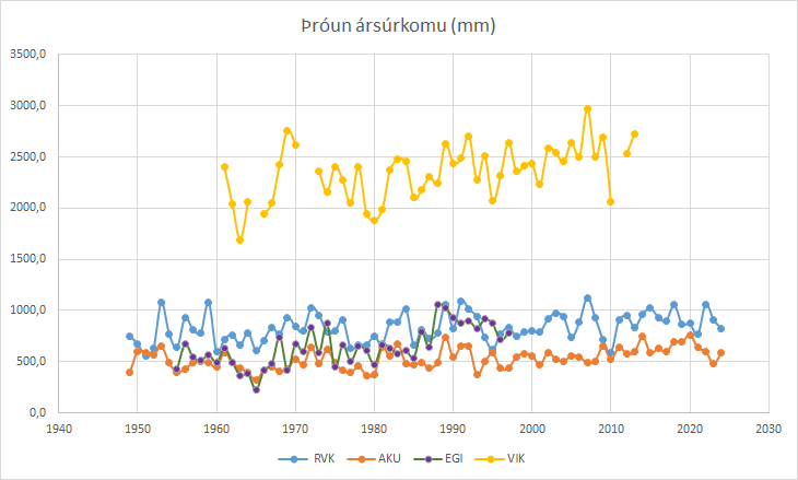 Áhugavert getur líka verið að horfa á þróun ársúrkomu yfir áratugina. Gögn voru ekki til staðar fyrir öll árin fyrir alla staðina, en hér sjáum við Reykjavík (RVK), Akureyri (AKU), Egilsstaði (EGI) og hinn rennblauta stað Vík í Mýrdal (VIK). Planta sem vill almennt þurrar aðstæður er kannski ekki fyrsti kostur fyrir Vík í Mýrdal.