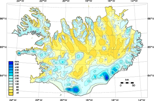 Á vef Veðurstofunnar má svo m.a. finna þessi fínu kort sem sýna meðalúrkomu júní og október mánaða um landið allt, miðað við 30 ára meðaltal (1971-2000). Þannig sjáum við myndrænt dreifinguna um landið á einna úrkomuminnsta mánuðinum og einum úrkomumesta. Úrkoman er þarna minni eftir því sem liturinn er gulari, meiri eftir því sem hann er blárri.