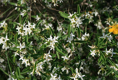 30 – 45 cm hæð, runni, Lauf 10-40 × 7-14 sm, oftast legglaus, stakstæð eða strjál, lensulaga eða öfuglensulaga, oft í knippum við greinaendana, dúnhærð einkum á neðra borði, grágræn. Blómin ilmandi, í 4-10 endastæðum blómhnoðum, bikar hvítur, flipar lensulaga, yddir. Pípan dúnhærð utan, 8 mm. Aldin rauð, gul-appelsínugul, kjötkennd, dúnhærð. Góð í steinhæðir og upphækkuð beð.